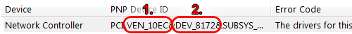 To identify the device, you need the "Vendor ID (VEN_xxxx)" (1) and the "Device ID (DEV_xxxx)" (2) which are contained in the PNP Device ID then visit www.pcidatabase.com